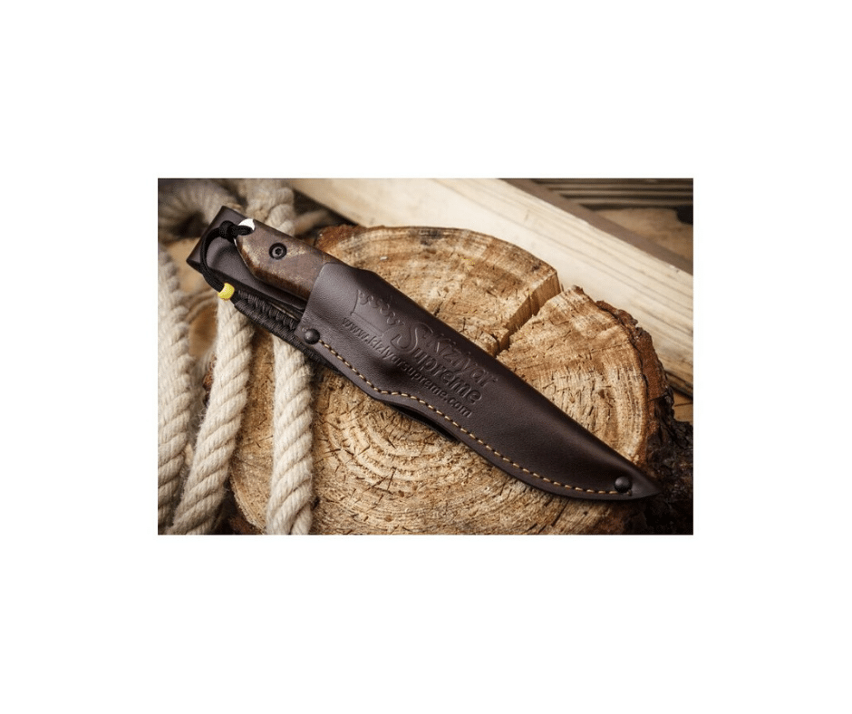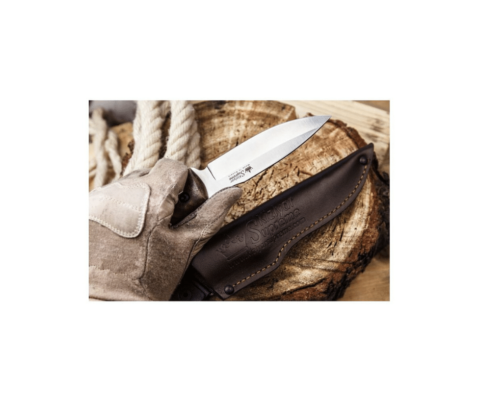 Nôž dodávaný s koženým puzdrom, ktoré umožňuje vysoké aj nízke zavesenie na opasok.